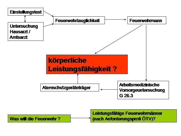 - Was heißt allgemeine Feuerwehrtauglichkeit? Ist der, der feuerwehrtauglich ist, auch körperlich leistungsfähig? Welche Untersuchungen und/oder Tests besitzen hier genügend Aussagekraft über die Feuerwehrtauglichkeit oder die körperliche Leistungsfähigkeit? Ist hier die körperliche Leistungsfähigkeit zuverlässig nachweisbar?