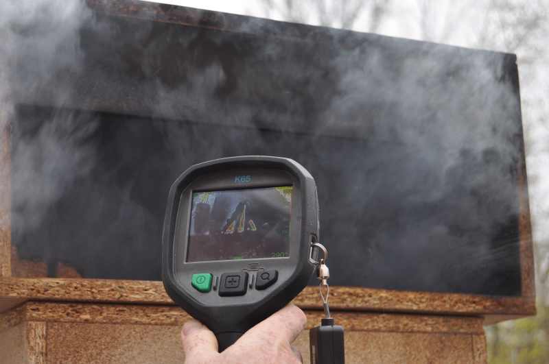 Beim Praxisteil ging es am offenen 1-Kammer-Modell neben der Visualisierung und Vertiefung des Verständnis zur Brandverlaufskurve und die Phänomene der Pyrolyse, Wärmemitführung, Flammenlängung, Rauch- und Raumdurchzündung. Und das alles in einem Zeitfenster von 5 Minuten! Gut, dass die Einzelheiten in der Theorie umfänglich und solide vorbereitet waren.